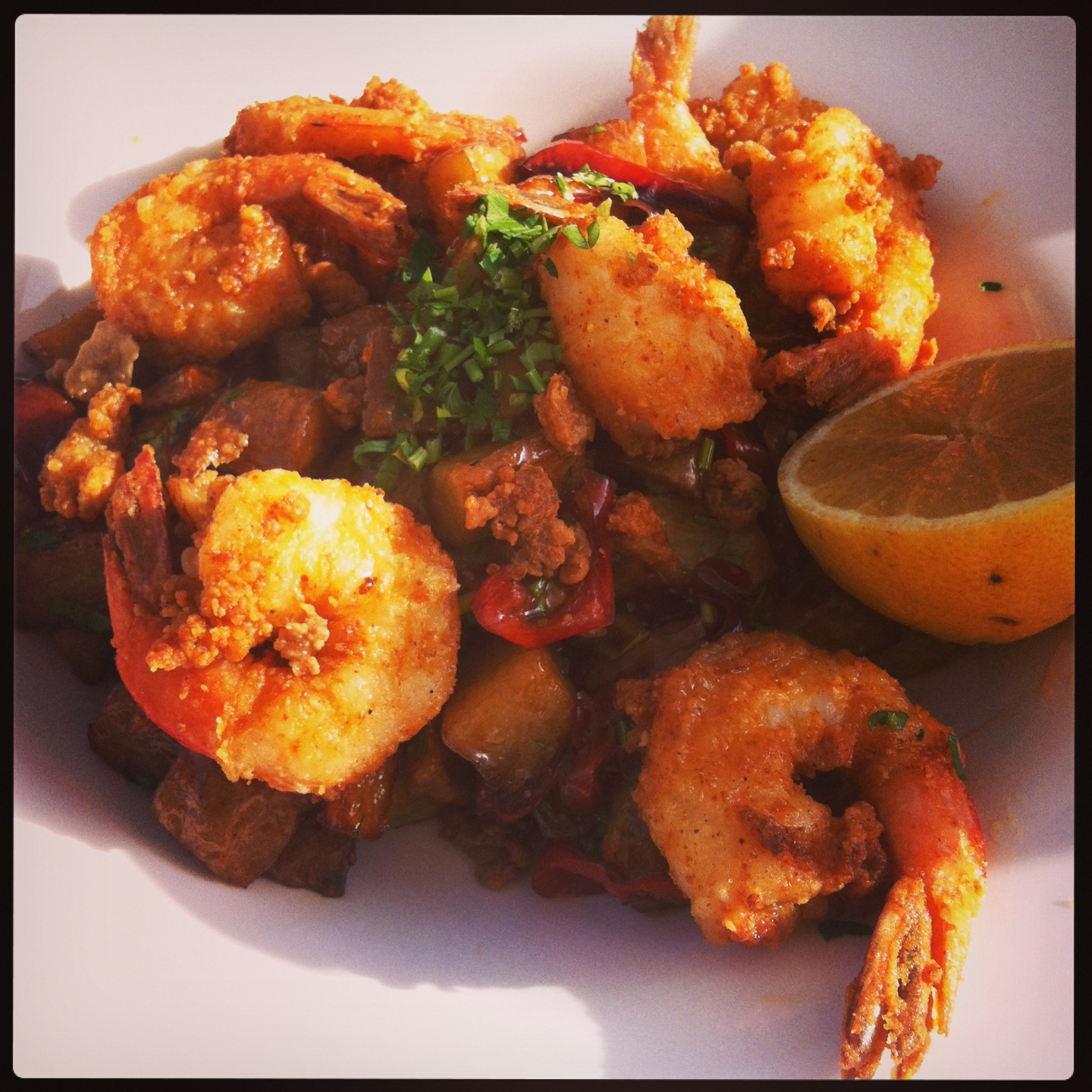 בגזרת האוכל, החלטנו לפתוח בנישנוש של שרימפס מטוגנים שהוגשו יחד עם הום פרייז (52 ₪). מדובר במנה גדולה לכל הדעות, שיכולה להוות עיקרית בפני עצמה. השרימפס עברו טיגון לא אגרסיבי והצליחו לשמור על טעמי הים הרעננים שלהם. ההום פרייז שהוגש יחד איתם, הוא ללא ספק אחד הטובים בעיר. לא עוד תפוחי אדמה שטוגנו יתר על המידה וסבלו מעודף רוטב צ'ילי ללא הבחנה, אלא נישנוש חריף - מתוק מתובל בקפידה, עם פלפלים חריפים ומתוקים, פטרוזיליה, ומרקם נכון של תפוחי אדמה - פריכים מבחוץ ונימוחים מבפנים.