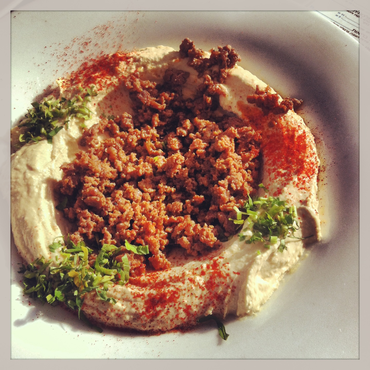 כדברי המשורר, עם האוכל בא התיאבון ובעוד שירי הזמינה חומוס עם בשר עגל מאגף הניגובים (42 ₪), אני המשכתי בקו הים תיכוני עם כריך שרימפס קריספי וגבינת גאודה (49 ₪). מנת החומוס הייתה גדולה ומשביעה וקיימה את שהבטיחה. בשר העגל שהוקפץ בחמאה (רעיון לא רע האמת!), נמס אל תוך החומוס ושידרג אותו מסתם עוד ממרח, לחומוס עם טוויסט.