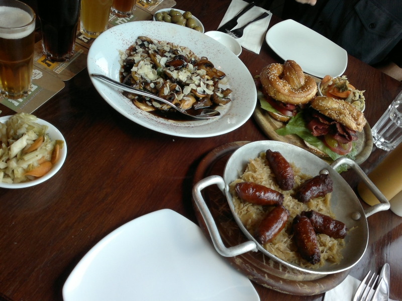 אחרי פתיחה מרתקת שכזו עברנו בשמחה לבשר, הליווי המושלם לבירה. למנות ראשונות בחרנו בפטריות השמפיניון החתוכות, מוקפצות ברוטב טריאקי מתקתק עם שקדים מולבנים קלויים - מעדן וכריך פרייצל במילוי רוסטביף שהיה מצויין ופיקנטי במידה המתאימה. גם מנת המיני נקניקיות שבושלו בבירה מקומית והוגשו על מצע כרוב כבוש הייתה טעימה להפליא.