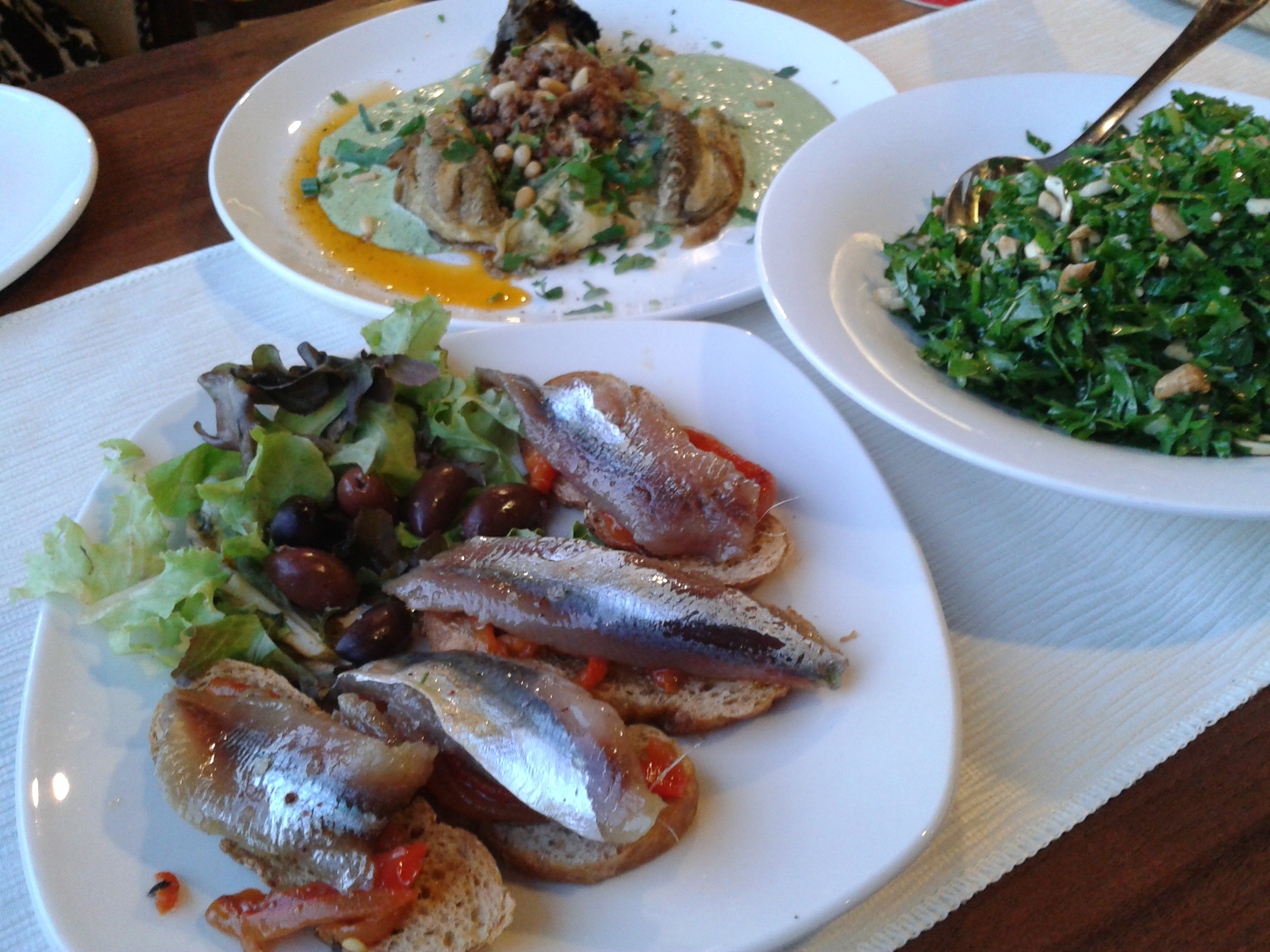 החציל נצרב היטב על אש חזקה, קולף והושרה בלימון לעידון המרירות, והוגש על טחינה ירוקה מקושטת בשמן פלפל אדום. בשר טלה קצוץ גס וצנוברים עטו על החציל והשלימו את המנה לחוויה של טעם ומראה. סלט העשבים, שנקצץ דק - דק רגע לפני ההגשה, הועשר בשברי קשיו קלויים, לימון והמון שמן זית. שילוב הירק הטרי והאגוזים העניק מרקם פריך ומענג וטעם עשיר. חמישה נתחי פילה אנשובי, מומלחים וכבושים בסגנון קפריסאי, הוגשו על ברוסקטה עם פלפלים צלויים לצד זיתי קלמטה והיו מתאבן מעורר תאבון. לכל החגיגה הוספנו שני חצאי בירה מהחבית, גולדסטאר ופאולנר, שהשתלבו נפלא עם מנות הפתיחה המלוחות (28 ₪ לחצי).