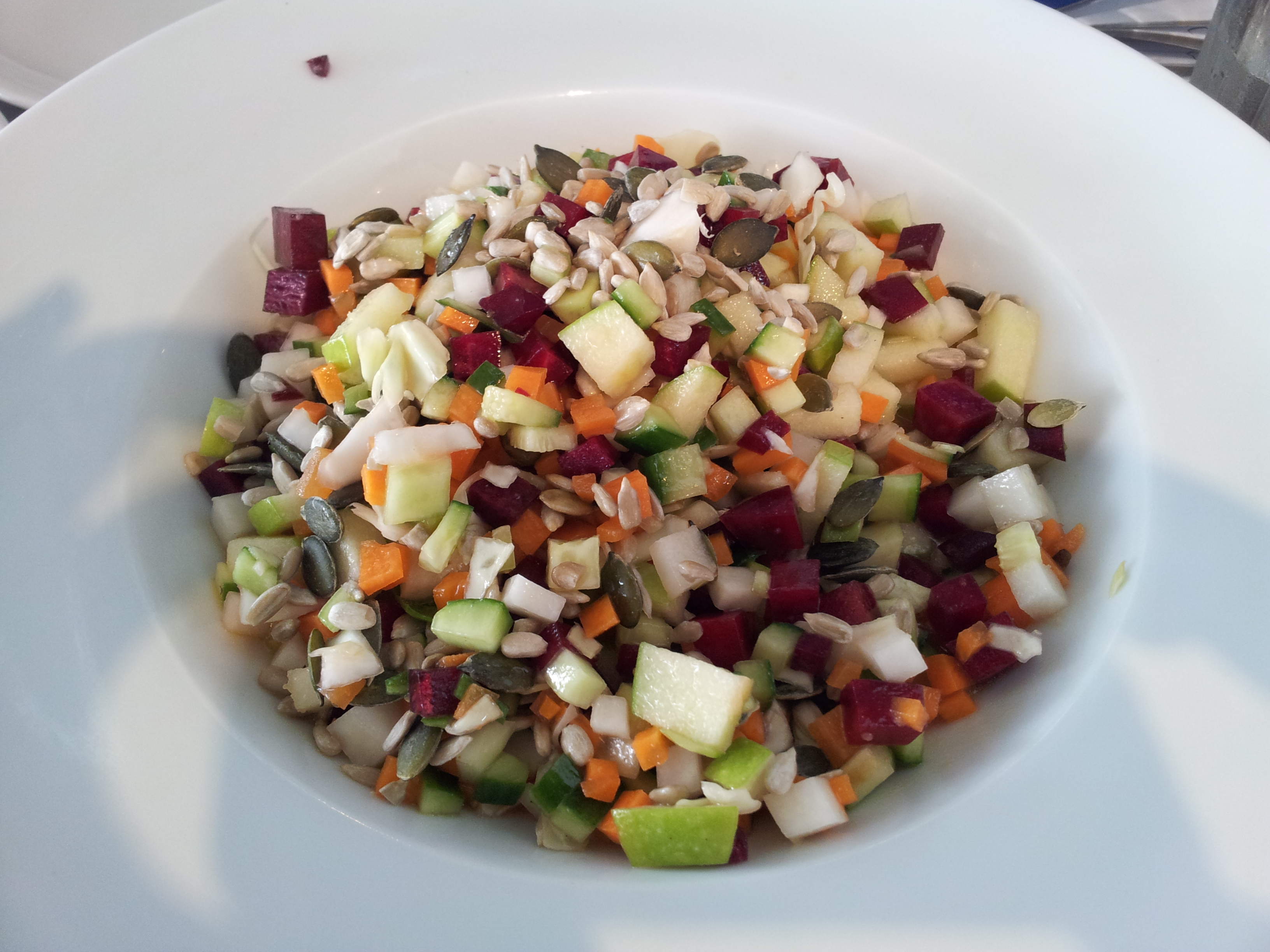 הפתיחה היתה צבעונית במיוחד וכן, מאוד שמחה. נהנינו מכל ביס של הגד"ש (גידולי שדה, בעגה קיבוצניקית אותנטית), עם סלט שהכיל את כל הטוב שהטבע יכול להציע - מגוון ירקות חתוכים לקוביות קטנות, סלק, כרוב, דלעת, חתיכות מתוקות של תפוח וגם גרעיני חמנייה השתלבו נפלא לתמונה צבעונית. המרכיבים פשוטים, צורת ההגשה מלאת מחשבה וכולם יחד יוצרים מנה עם לוק חדשני וטעם מרענן (44 ₪).