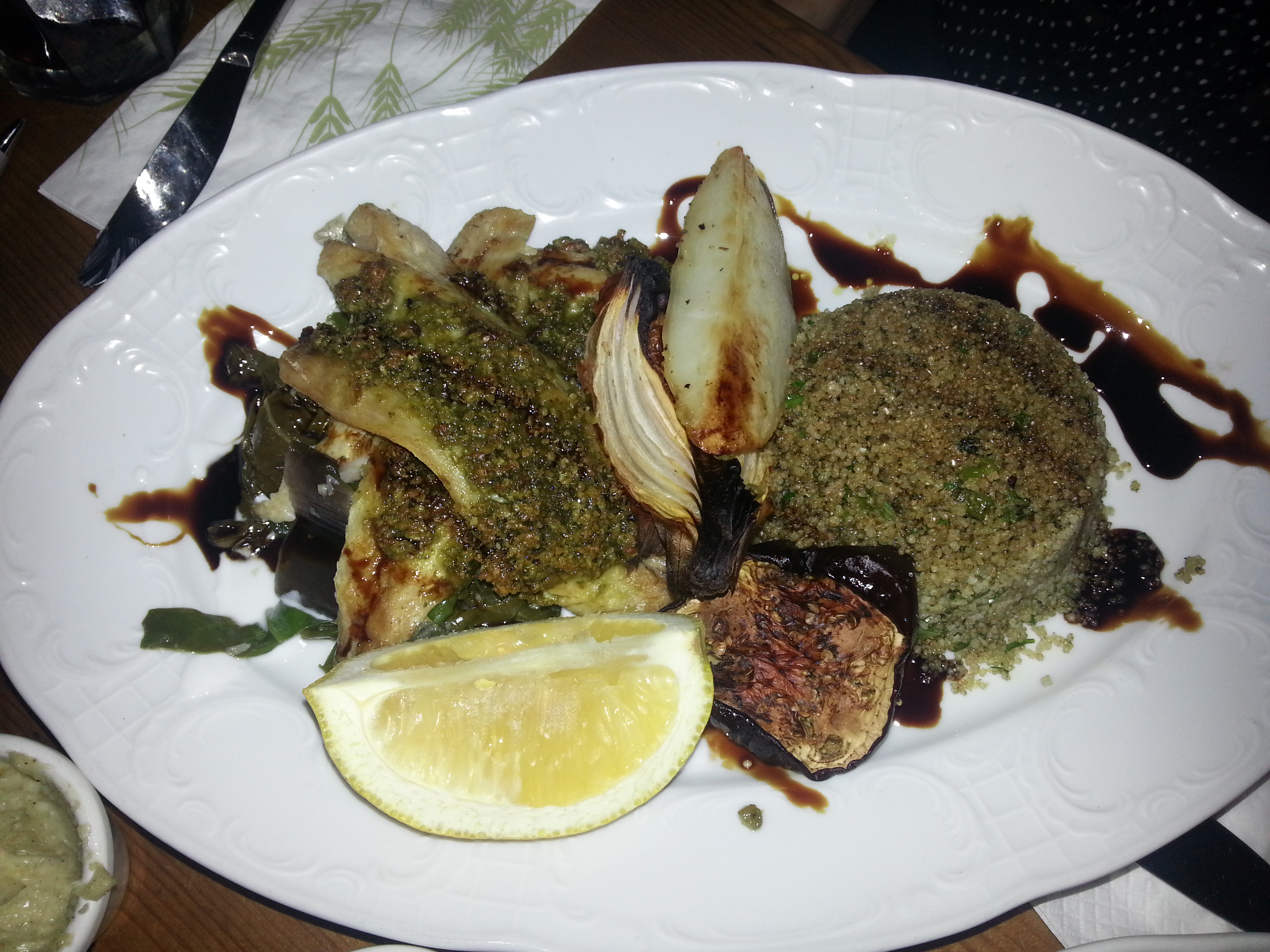 לא נעים לומר שהיינו כמעט מלאים. השייק הירוק ואחריו מנת הענק של הקדאיף עשו את פעולתם, ואולי גם הקיבה שלי שקצת הצטמצמה לרגל המאורע אבל זה לא עצר אותנו מלהתקדם לעיקריות. אולי אנשים משתנים, אך לא עד כדי כך. אתם מבינים, העיניים נשארות גדולות, גם אם הקיבה קצת פחות. מתוך אגף ה"משביעות של לואיז" בחרנו בפילה בס עם קרסט שיבולת שועל, תרד עם יוגורט, עלי מנגולד וזיתים, לצד תוספת לבחירה- קוסקוס מלא. רעבים או שבעים לחלוטין- כבר שכחנו. הציפוי היה אחד הדברים המקוריים והטעימים ביותר שנתקלתי בהם, לא פגע כהוא זה בטעמו של הדג ועם זאת שידרג אותו ללא היכר. שיבולת שועל שבאה במגע עם דג היא הברקה שאין לתאר, כך התברר לי. הקוסקוס המלא היה מתקתק ולא ממש דמה לקוסקוס המרוקאי שאנחנו אוכלים בימי שישי ובהחלט היה בעל ייחודיות משלו.