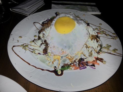 אגף המנות הראשונות בקפה לואיז מכונה "קלילות" ובהמלצתו החמה של המלצר טעמנו מנה של קלילה של קדאיף גבינות. שערות קדאיף אפויות במילוי גבינת עיזים ופרמזן בתערובת פשתן ושומשום, בתיבול שמן זית עם ציזיקי על עלי בייבי, תרד בויניגרט בלסמי ומעל כל אלו ביצת עין. אינני יודעת בקשר לבריאות, אבל שני דברים בקשר למנה הזו אני יודעת בוודאות: ראשית, היא עצומה בגודלה. אין שום צורך להזמין יותר ממנה ראשונה אחת, דעה שהתחזקה כשהבטנו מסביב לשאר המנות הראשונות. שנית, מדובר במנה מצטיינת שאי אפשר להפסיק לאכול אותה. אטריות הקדאיף שמוכנות במקום מקבלות בברכה את שלל הגבינות הנמסות בתוכן, בעוד הביצה שמעל היא התוספת שמשדרגת את כל העניין. ואם כבר מצטיינת, אז אין ספק שמגיע גם דוז פואה על מקוריות.
