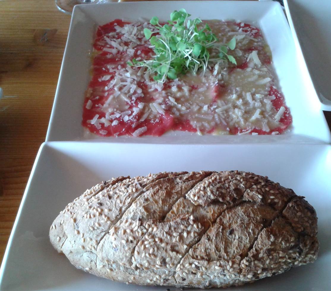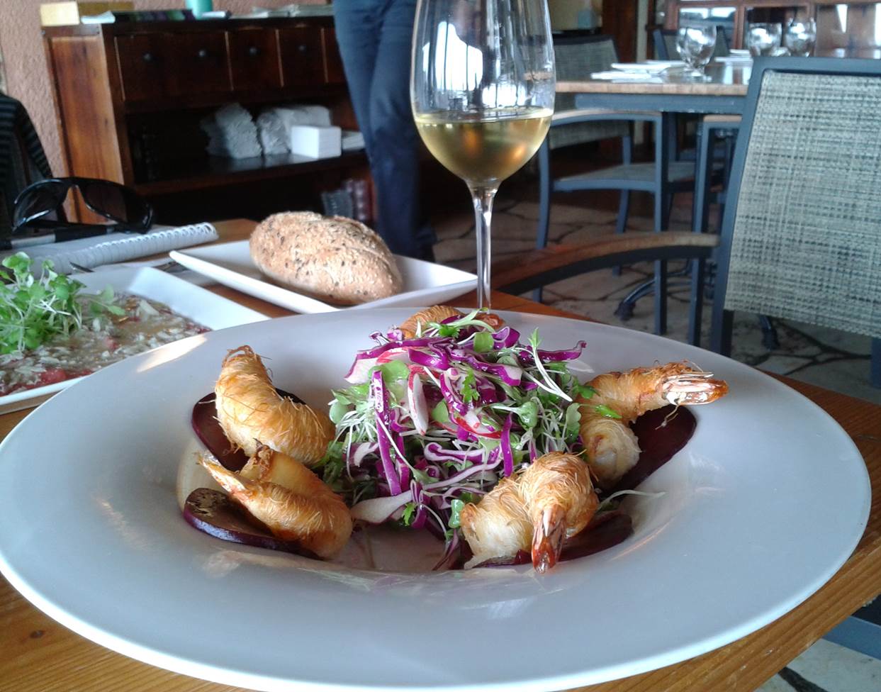 קרפצ'יו עסיסי מנתח פילה רודד לעובי מושלם והוגש בצלחת רבועה לצד לחם דגנים ביתי ופריך, כשמעליו נבזקו פרמז'ן מיושנת ורוטב וויניגרט לימוני שהוסיף רעננות מקורית. איכות הבשר והפרמזן וניחוחות הרוטב השתלבו לקרפצ'יו נהדר. מקורית ומסעירה אפילו יותר הייתה מנת החסילונים. לאחר שנשלקו, נעטפו בשערות קדאיף ועברו טיגון קצר בשמן עמוק שהפך אותם לפריכים ועסיסיים להפליא, סודרו החסילונים על פרוסות דקיקות של סלק חלוט סביב סלט צבעוני של כרוב אדום, נבטוטי כוסברה מלאי טעם, ופרוסות צנונית. מיץ לימון, שמן זית ויוגורט חמצמץ היו רוטב מושלם למנה, שלטעמנו הייתה המרתקת ביותר, הן מבחינת שילוב הטעמים והן מבחינת צורת הגשה והיא זכתה לציון דוז-פואה. במקביל, לגמנו וינייה של הרי גליל, יין לבן בצבע זהבהב בוהק עם ניחוחות פרחוניים - עשבוניים וארומה של משמש בשל וכוס של קברנה גליל, שאנו אוהבים בזכות צבעו הכהה והמפתה ומגוון ניחוחות של פירות היער (26 ₪ לכוס יין).