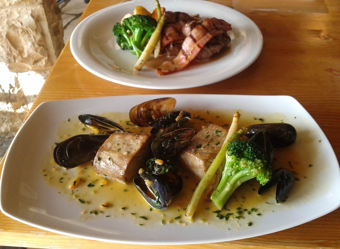 היינות נשאו אותנו בבטחה אל העיקריות. ראשונה להגיע הייתה ספיישל טונה אדומה ומולים ברוטב סרסואלה קליל וקטיפתי של חמאה, יין לבן, שום ועגבניות. הטונה, מוצקה ועסיסית, בושלה קצרות ברוטב כך שנותרה נאה במרכזה וכשנחתכה חשפה חיוך אדום ומגרה והשתלבה היטב עם טעם המולים. נתח הסינטה נצרב לרמת מדיום ועטה עטרה שמנמנה, כמעט קדושה, של בייקון בעישון ביתי ורוטב מתקתק של ציר עוף ומייפל. בטטה ותפוחי אדמה אפויים, ברוקולי ואספרגוס מאודים היו תוספת משלימה למנה היפה והמיוחדת, ששילוב הטעמים בה היה מעניין וטוב וההגשה שובת עין.