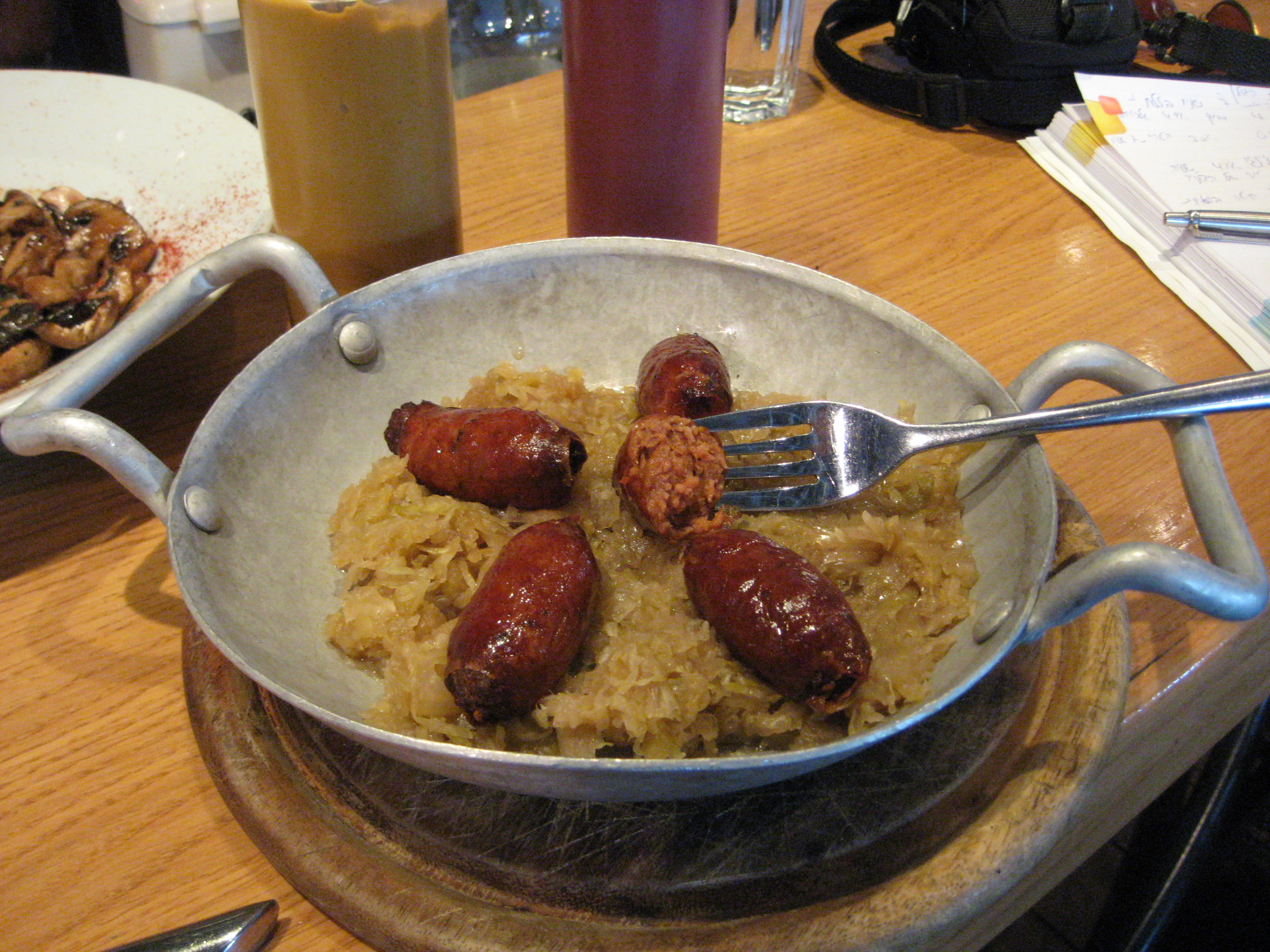 שלל הצבעים, אדי האלכוהול שכבר התערבבו בנשימותינו וטיול מפלים קצר שקדם לביקור במבשלה פתחו אצלנו תאבון אדירים. פרצל בווארי משוח ברוטב ברביקיו (שהוספנו לו בנדיבות חרדל, קטשופ ומיונז) עם פרוסות כתף בקר בגריל, חסה, עגבנייה ומלפפון כבוש היו נשנוש מושלם לצד הבירה (32 ₪ לשני בייגלך). נקניקיות מיני מבשר בקר על כרוב כבוש מבושל בבירת המבשלה (34 ₪) המשיכו את אותו קו, שלי באופן אישי יש חולשה קשה אליו. הנקניקיות השמנמנות התפצחו בקול קנאק עסיסי בכל נגיסה, והכרוב היה עשוי לעילא.