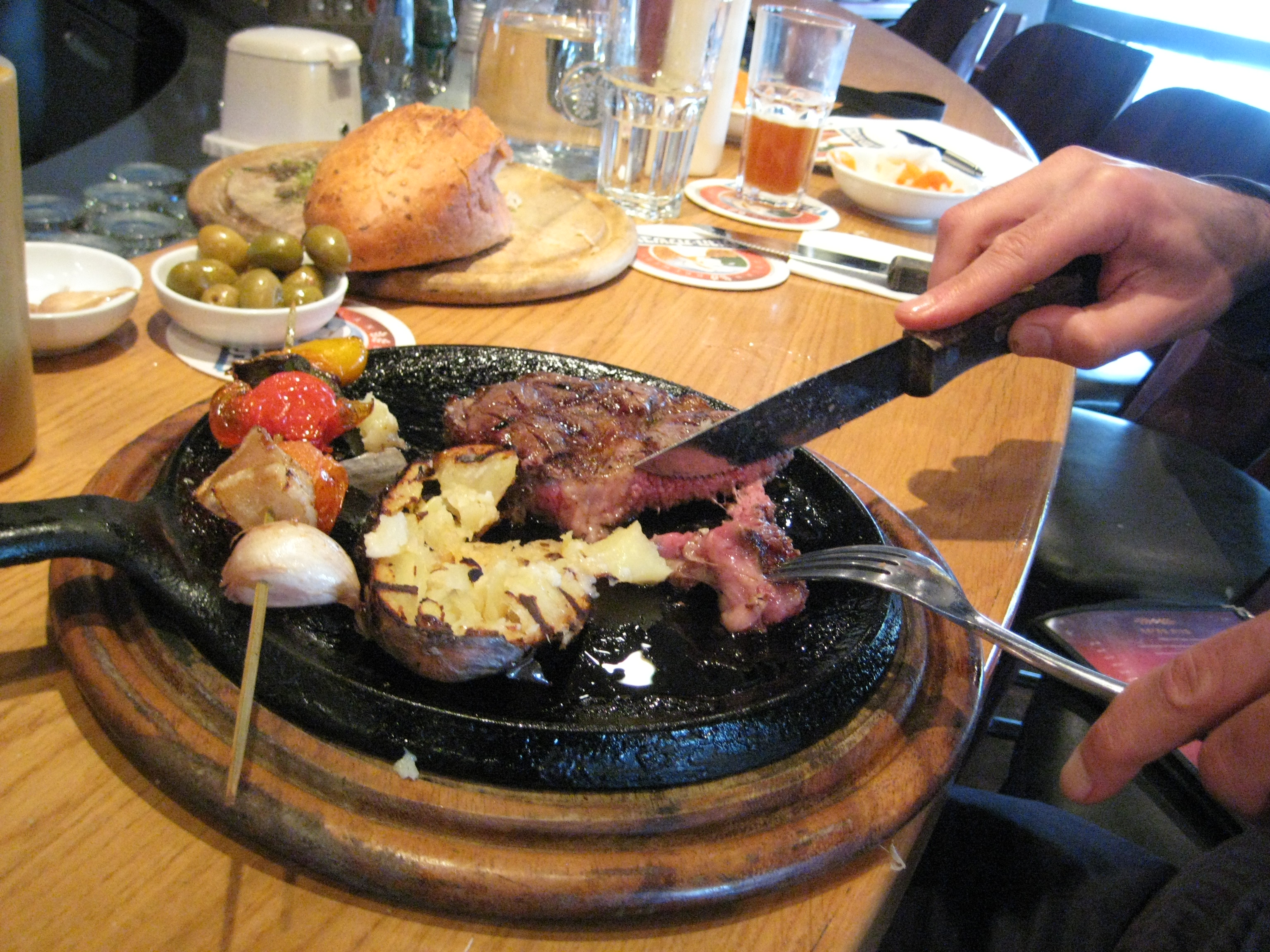 בעלי סגנון לוקאלי יותר ימצאו בתפריט כמה אפשרויות מעניינות, כמו חציל בלאדי צרוב בגריל בטחינה ופסטו (18 ₪) שהיה נפלא בדיוק כמו שהוא צריך להיות. לבסוף חלקנו סטייק אנטריקוט רך ומשוייש, שהוגש על פלנצ'ה לוהטת עם תפוח אדמה אפוי ושיפוד ירקות בגריל לצד רוטבי צ'ימיצ'ורי ושום (112 ₪). הבשר המשובח שנצלה ביד אומן לדרגת מדיום מדויקת לא נזקק לרטבים והתמוגגנו על טעמו הטבעי ומיציו הניגרים.