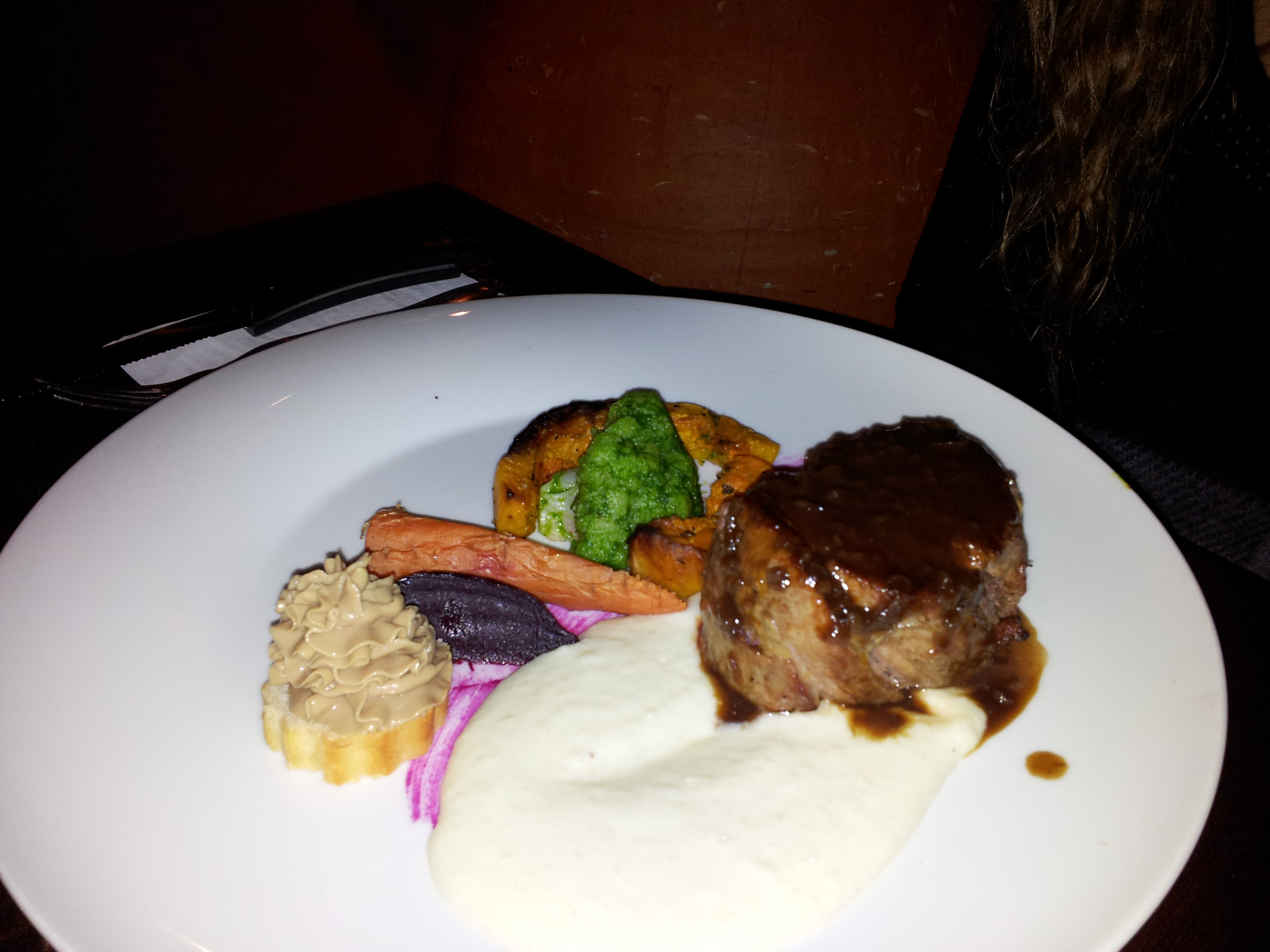 לנוכח המראה של המנות העיקריות היה צורך לעצור ולצלם. כמובן שגם היה גם צורך עז לעוט על המנות לפני שיתקררו. כל המנות היו מושלמות ובלתי רגילות אבל כוכב היום ללא ספק, היה פילה הבקר עם פטה הכבדים ברוטב בורדלז לצד ירקות צלויים וקרם תפוח אדמה (148 ₪). הרוטב המענג העונה לשם "בורדלז" הוא רוטב המגיע מאזור בורדו בצרפת (מכאן שמו) ומבוסס על יין אדום, ציר בקר ובצלצלי פנינה. קרם תפוחי האדמה הוא ללא ספק הצורה הכי טעימה להגשת תפוח אדמה כלשהו ומהיום אני דורשת לקבל את תפוחי האדמה שלי רק כך! הקרם נימוח בפה ומשאיר תחושה של עוד כשרוטב הבשר הנמזג מעל לצד הפילה בהחלט משאיר מקום למחשבות, תהיות, ורצונות עזים לארוז הכל ולהגר לצרפת (לפחות עד שאלמד איך לבשל כך!)