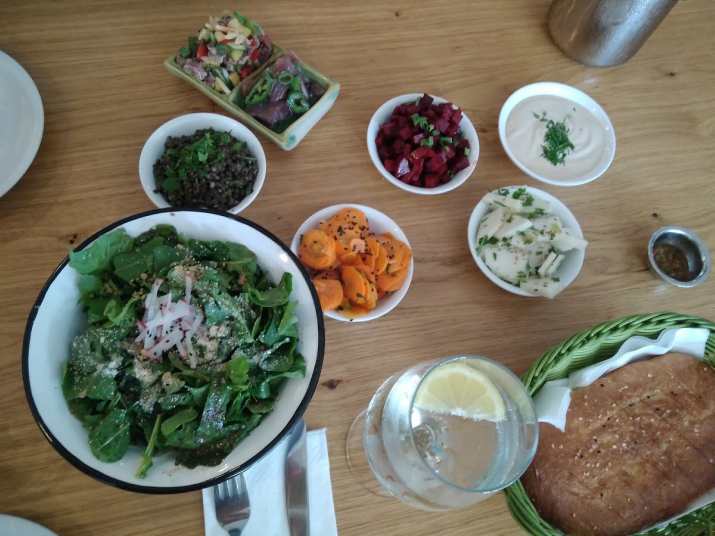 התפריט מורכב בדרך כלל (גם סופ"ש גם צהרים וגם בערב) מסלטים מדהימים עליהם אפרט בהמשך, דג שלם (זה משתנה בהתאם לדיג היומי) ופילה דג (שגם הוא משתנה) .סדר ההגשה הוא מים מים מים כמובן! אני הזמנתי גם שפריץ בצד (למי שלא פולני זקן כמוני אסביר – יין עם סודה) , בן זוגי הלך על בירה מהחבית צוננת קלילה שממש מתאימה למקום – BELL שהיא בירה נהדרת! ולאחר מכן הגיעו הסלטים, סלט ג'רג'יר (או בשמו הספרותי עברי – גרגר נחלים) מטריף עם המון לימון וטיפה אגוזים, גזרים עם סומסום שחור, קולורבי חמוץ, עדשי פנינה עם כוסברה, טחינה נהדרת ולחם שילך טוב עם החריף החריף אש שהוגש לצידו. וכמעט שכחתי תפוח אדמה בסגנון מדורתי משהו, שחור ומפוחם פתוח לשניים מתובל בלא מעט חמאה מלח ובצל ירוק, באמת שלא חשבתי שתפוח אדמה יכול להגיע לשיאים כאלו.