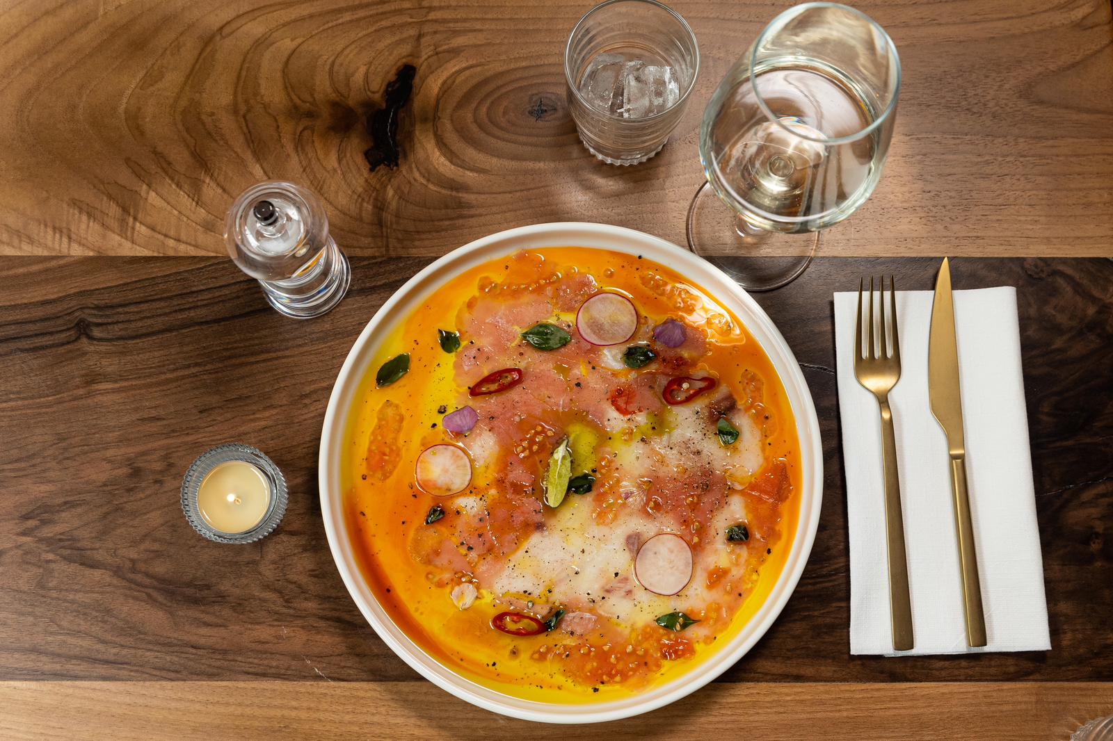 הפסיפס הירושלמי: קרפצ'יו של טונה אדומה ודג לבן, שחלות עגבנייה זוטא ופיינגר ליים
