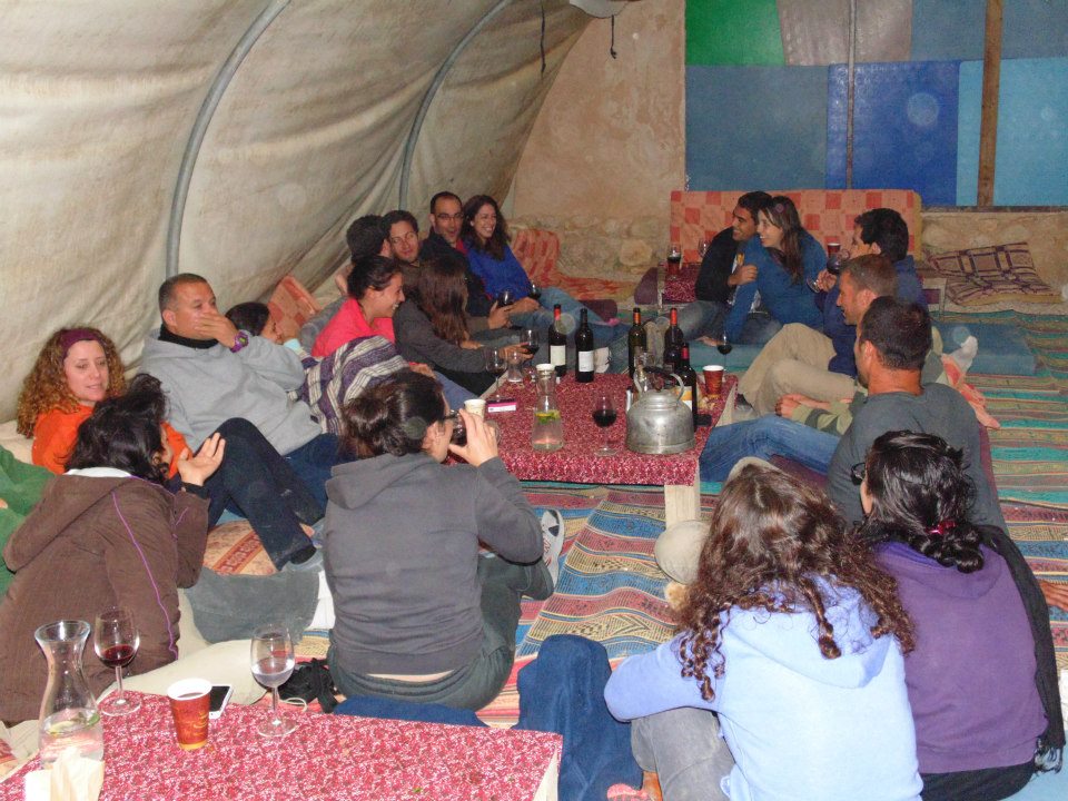 אי אפשר בכלל לתאר את שילוב הטעמים הקסום הזה, שלא לדבר על הפיתה הענקית שספחה אליה את כל הטעמים והפכה למעדן מלכים. האורז שהתערבב עם בשר הכבש היה נדיר ואי אפשר היה להפסיק לאכול מהמנסף הזה. זמן רב לא נתקלנו בתבשיל כה מלהיב ועוד בלב המדבר. הכמויות היו אדירות וגם התיאבון של החבר'ה היה מכובד לא פחות. עם כל סיר שנעלם, מיד התמלא סיר אחר, ועוד לא דיברנו על האלכוהול. תומר, הסומלייה שלנו, הסתובב בין השולחנות בכל פעם עם יין אחר בידו, ממלא את הכוסות עד לא ידע. מי שרצה בירה כמובן קיבל, אבל מי רוצה בירה כשיש כל כך הרבה יין?