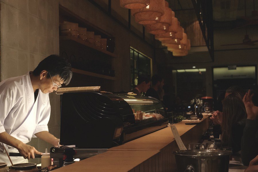 תחושה חמימה מגיעה מעיצוב בעץ, בשילוב אלמנטים עיצוביים שהביא אלי מיפן, ואפילו כלי האוכל האיכותיים יובאו משם. לכל כלי (עבודת יד) יש אופי משלו, וביחד הם משלימים לפסיפס צבעוני, בשילוב תאורה נעימה. אז כן, קודם כל נעים לשבת כאן.