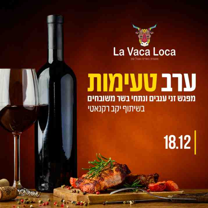 "אין שמחה אלא בבשר ויין" שמוזכר בתלמוד, הוא בין הדינים ההלכתיים החביבים עלינו. וכנראה שלא רק עלינו, אלא גם על קברניטי מסעדת LA VACA LOCA, הגלגול המודרני של מסעדת אל גאוצ'ו ההרצליינית. ב-18 בדצמבר (יום שלישי) יתקיים במסעדה הארגנטינאית ערב טעימות אקסקלוסיבי שבו תוכלו להיפגש עם נתחי בשר איכותיים וזני ענבים משובחים. הערב החד-פעמי (והמומלץ במיוחד) יתקיים בשיתוף עם יקב רקנאטי וצפוי להיות חוויה בלתי נשכחת. עוד נציין שמספר המקומות מוגבל ולכן מומלץ ביותר להקדים להירשם.