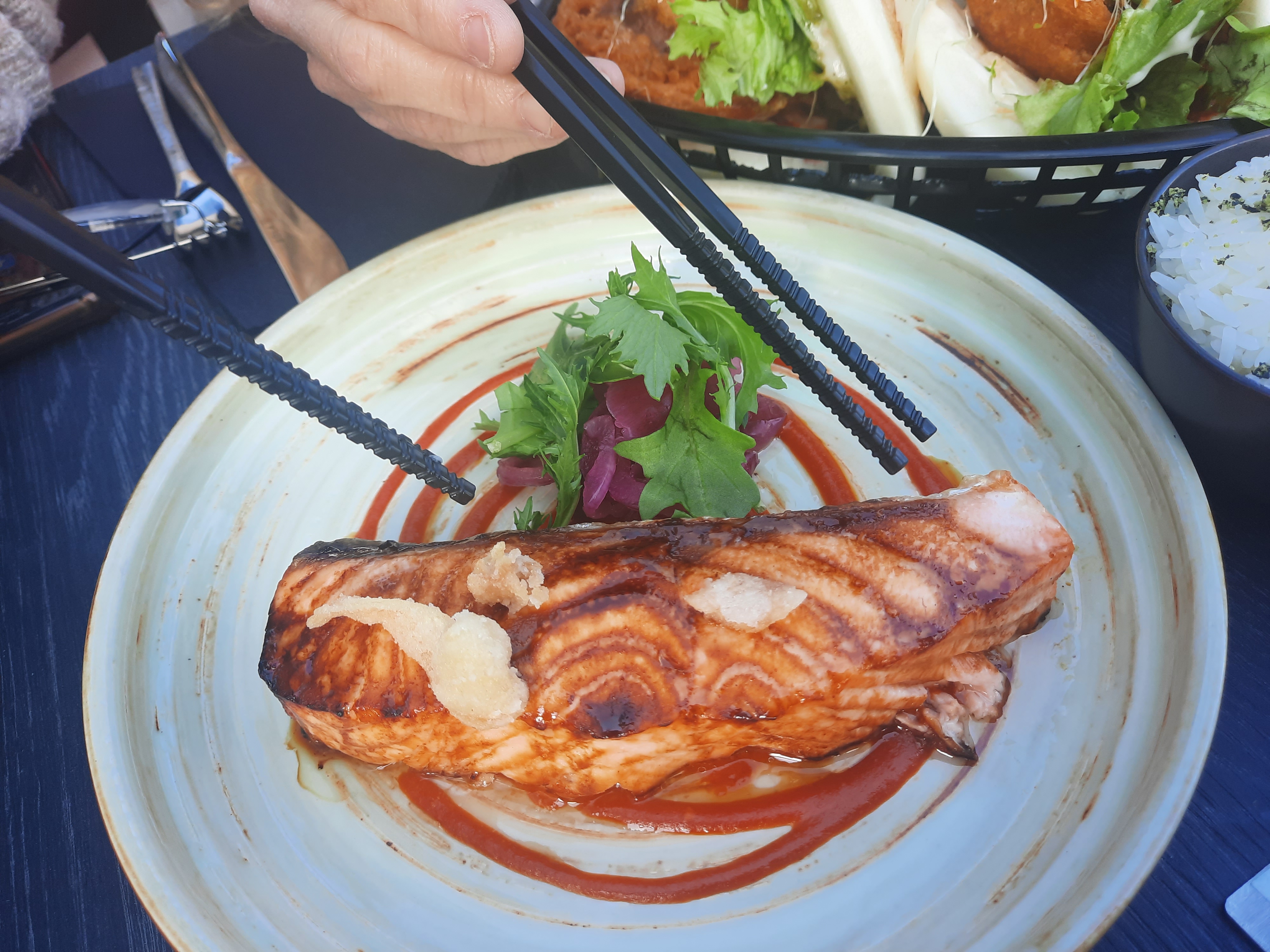 לקחנו את הסלמון שלנו בכמה וריאציות: נקי, עם טריאקי, ניגירי ועם אבוקדו. "סושי-פרשי" כמו שקראתי לו, הציג את הערך המוסף בכל מנה - הרעננות, הסטיקיות, הבוהק והשילוב המנצח שגרם לנו להתפעל מהמיצים שנשאבו מהאורז, מהטריות של מחית האבוקדו, הצבע הדומיננטי, הדיוק והבשרניות של החתיכה היפה, שכאילו רקדה ואלס עם כל התוספות מסביבה. מה יש להגיד? סלמונדיאל! תנו את הקומבינציות האלו למי שלא נמנים על חובבי טרנד הסושי; יש סיכוי לא רע שחלק מהם ישנה את דעתו.