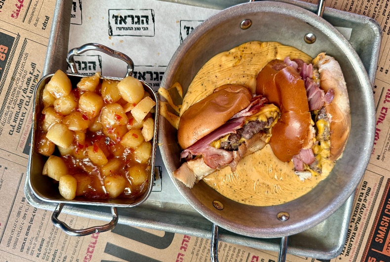 הטרנד הנוכחי שם הוא דאבל סמאשבורגר, עם בייקון טלה, שנחצה לשני חלקים שמונחים, סליחה, שוחים באמבטיית צ'דר. לא "עם גבינה מעל". לא "עם נגיעת רוטב". אנחנו מדברים על קערה שבה ההמבורגר אשכרה עושה צלילה בתוך מחבת מלא ברוטב גבינה סמיך, כתום ולוהט.