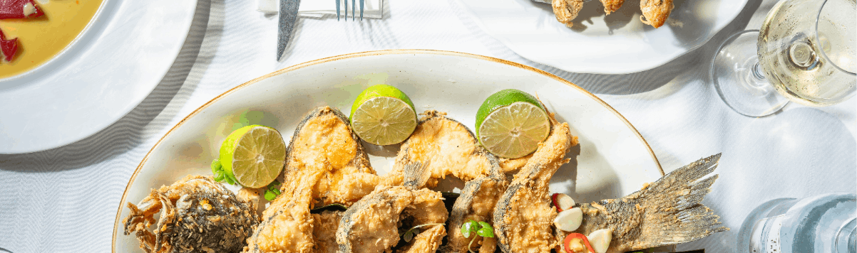 דג במשקל לשני סועדים, מגיע פתוח כפרפר עשוי בגריל.