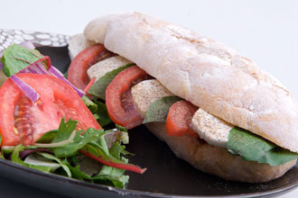 כריך בפלוט לבן/מלא, טחינה, חציל קלוי, מלפפון חמוץ, טופו, עגבנייה, חסה מוגש בתוספת ירקות בוינגרט הדרים