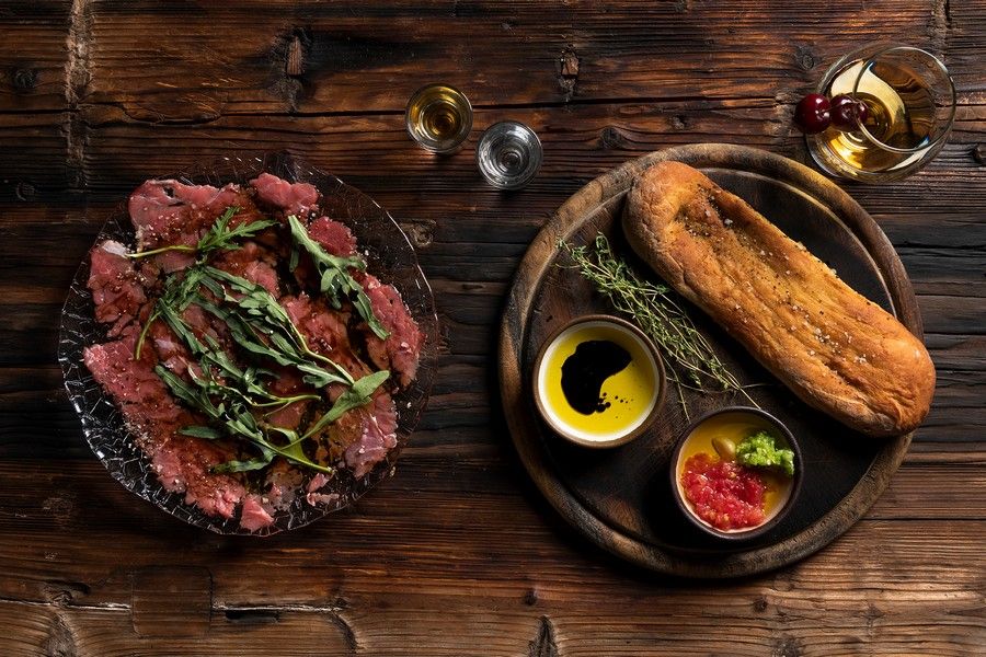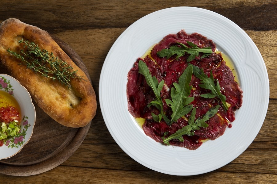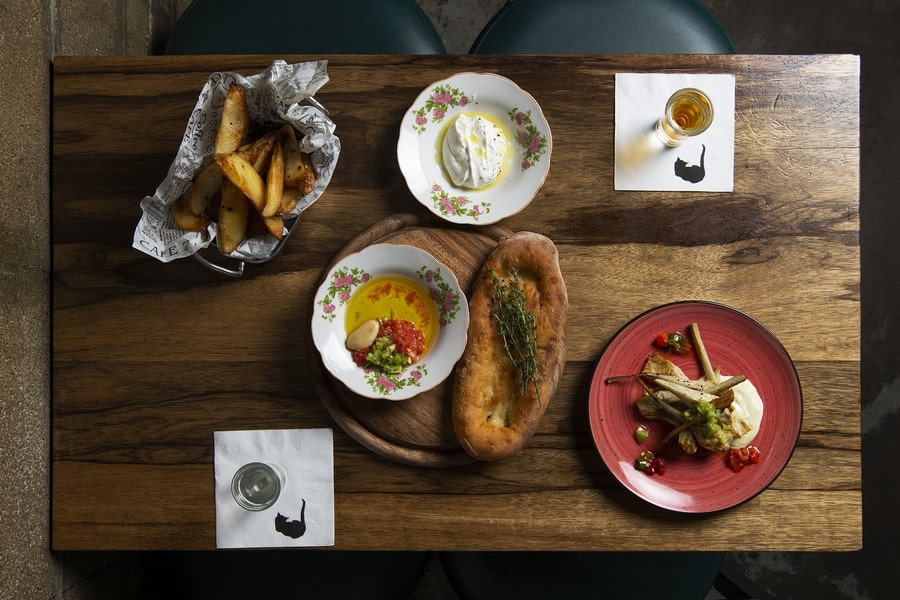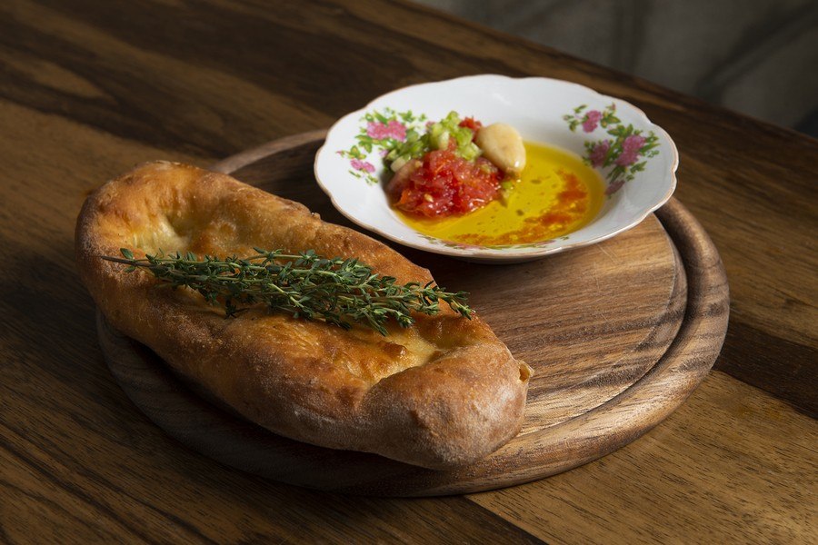 מוגשת עם שמן זית, שום קונפי, חריף וסלסת עגבניות