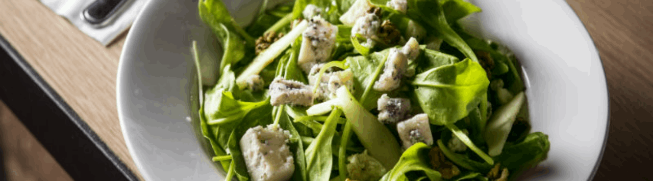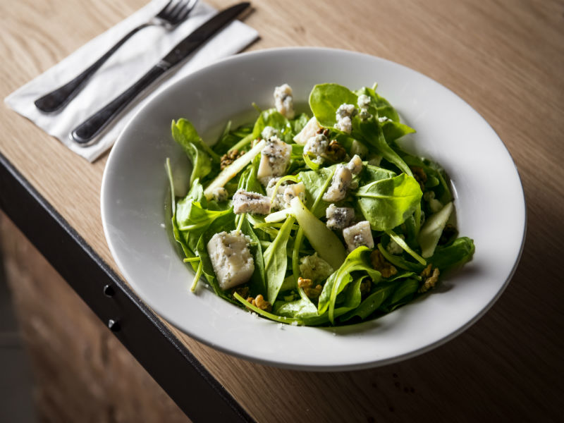 גבינה כחולה, ארוגולה, תפוח עץ, בצל סגול, עלי זעתר, אגוזי מלך מסוכרים וויניגרט חרדל