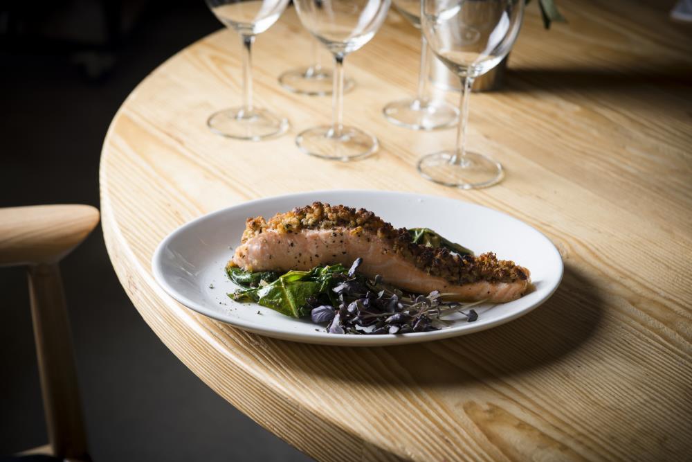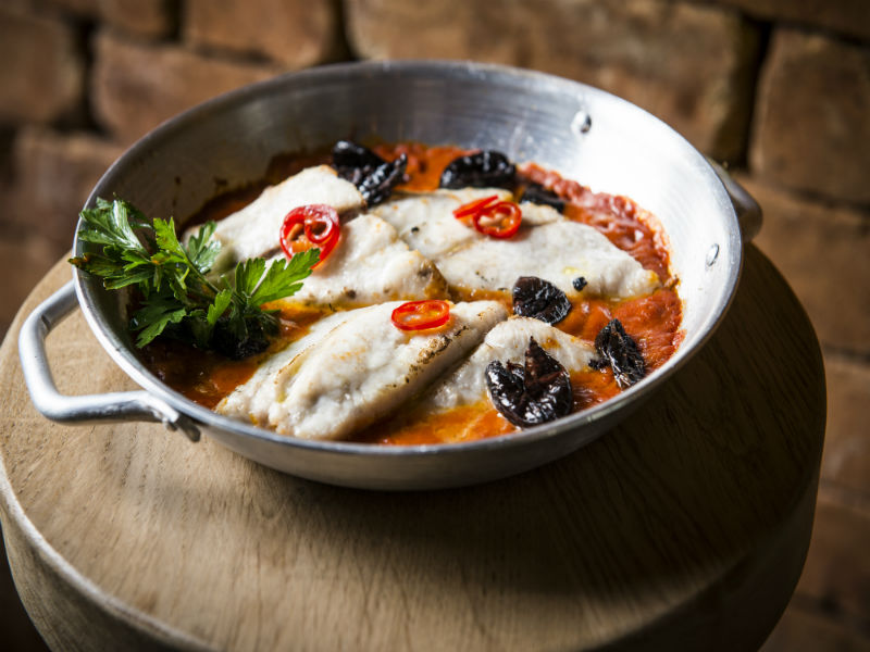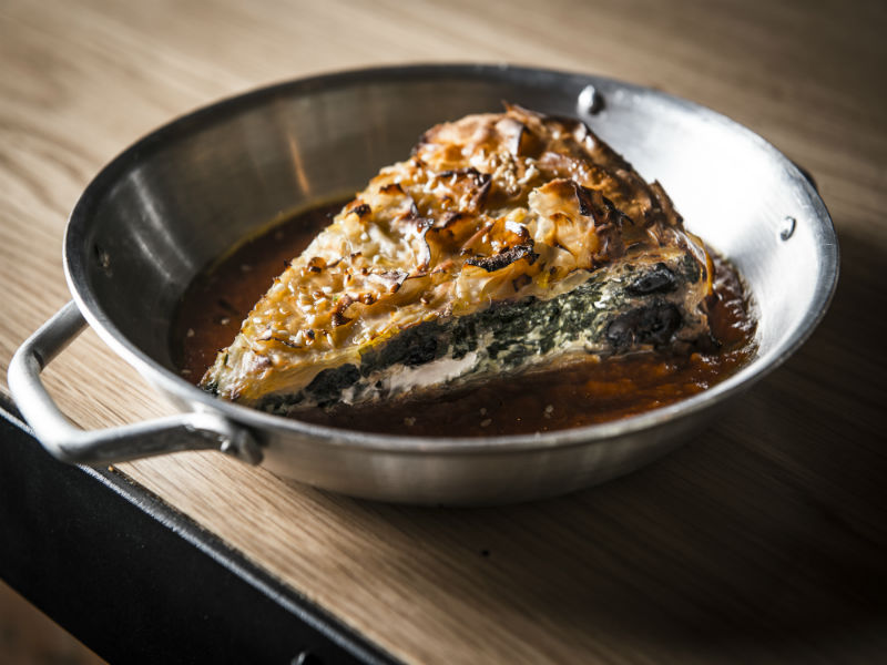 צלוי על הגריל, עלי תרד, בצל, שום קונפי עגבניות שרי וזיתים