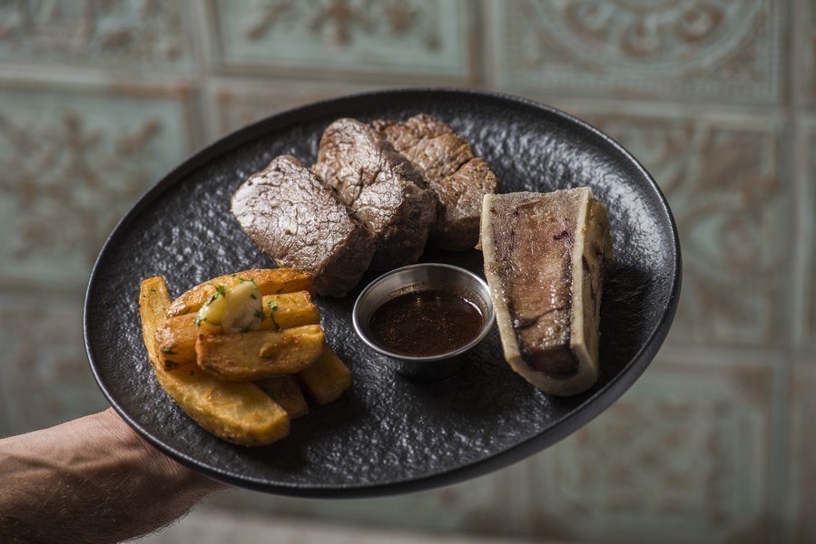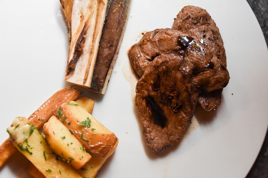 סטייק סינטה 300 גר' מבקר אנגוס מיושן צרוב על הפלנצ'ה, בתוספת תפוח אדמה, מח עצם ורוטב צ'ימיצ'ורי