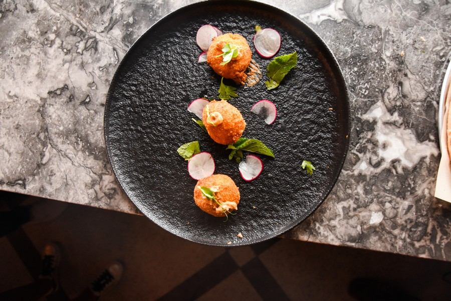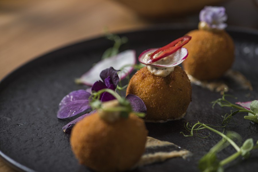 כדורי ריזוטו פריכים עם גבינות ובטטה צלויה מוגש על איולי בזיליקום ועגבניות