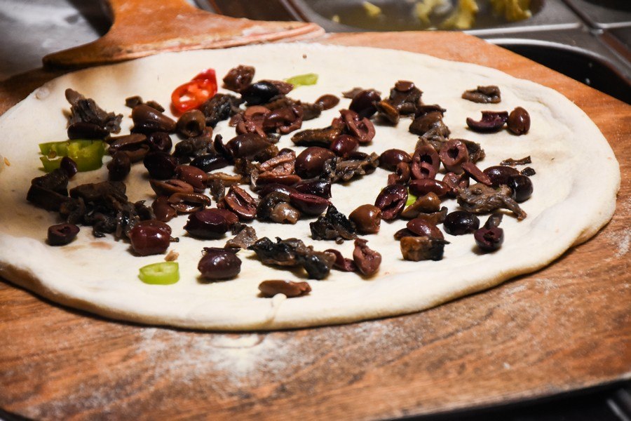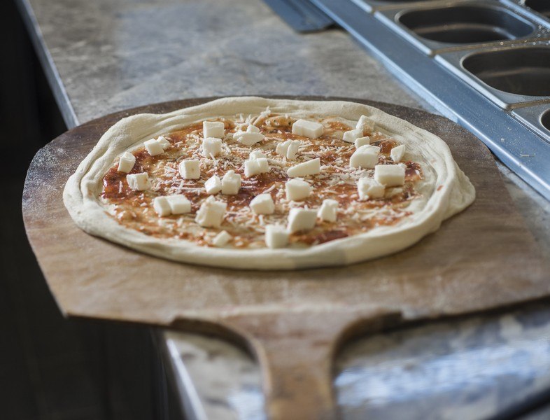 רוטב עגבניות, מוצרלה, פפרוני עגל, צ'ילי טרי ובצל סגול