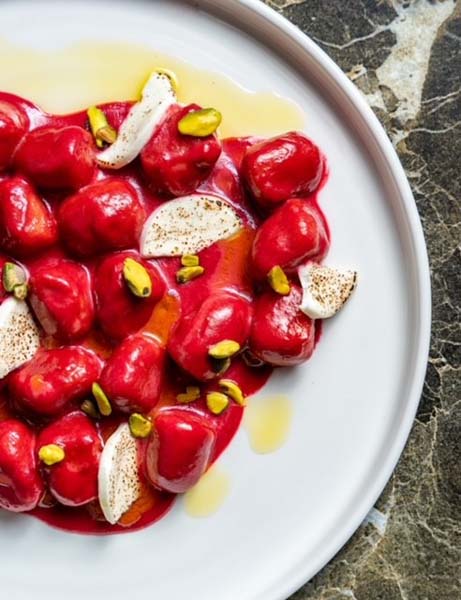 מוצרלה במילוי קרם שמנת על פסטו, שקדים קלויים, רוקט ובלסמי מצומצם