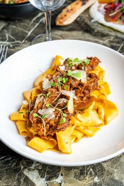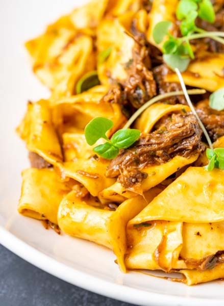 שכבות פסטה עם רוטב בשמל ותבשיל בשר עשיר אפוי בטאבון על רוטב רוזה ומוצרלה