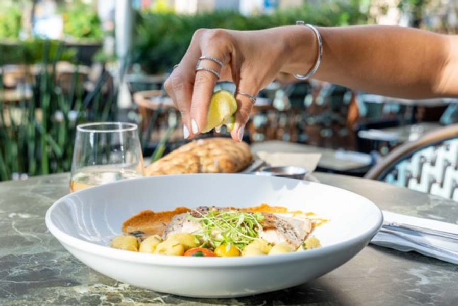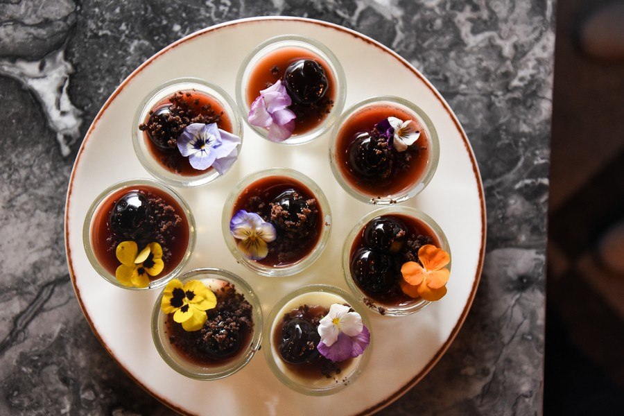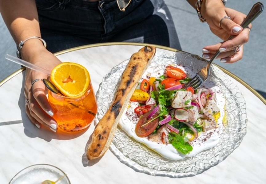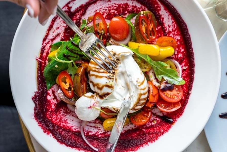 מוצרלה במילוי קרם שמנת מוגש על אורוגולה, סלט עגבניות שרי, בצל סגול וזיתי קלמטה, פסטו, צנוברים קלויים, בלסמי מצומצם