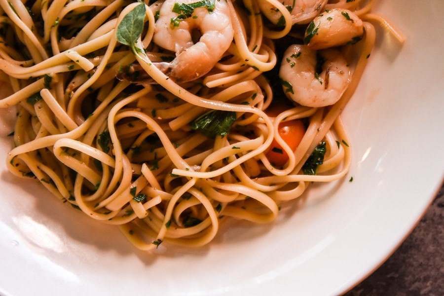 פסטה טריו, שרימפסים צרובים בחמאת מידטרנו, אנשובי, בצל סגול, צלפים, שום וצ'ילי, יין לבן ופטרוזיליה