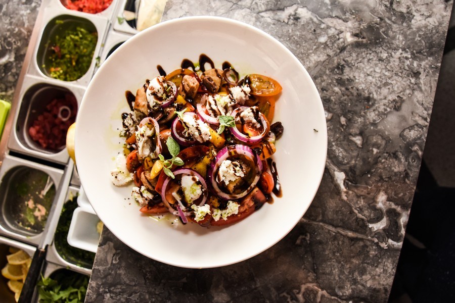עגבניות שרי צבעוניות, בצל סגול, גבינת מוצרלה רכה, זיתי קלמטה, צלפים, קרעי פוקאצ'ה פריכים, ויניגרט בזיליקום ובלסמי מצומצם