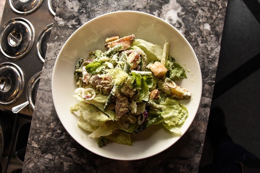 לקט חסות פריכות, רוטב קיסר, קרעי עוף צרוב, קרוטונים, בצל סגול וגלופות פרמז'ן