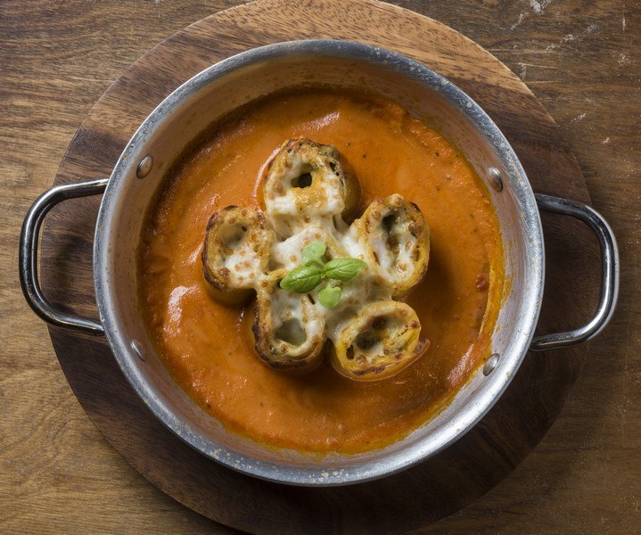 דפי פסטה טריים מגולגלים במילוי של קרם בטטה, ריקוטה, תרד, גבינת מוצרלה ופרמז'ן, נאפה בטאבון העצים ברוטב נאפולי