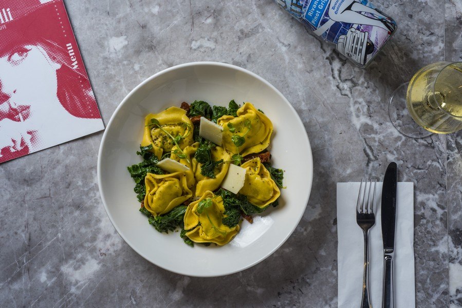 פסטה טרייה ממולאת בתרד וריקוטה, ברוטב שמנת עם עגבניות מיובשות, שום חמאה, יין לבן, וקרם תרד