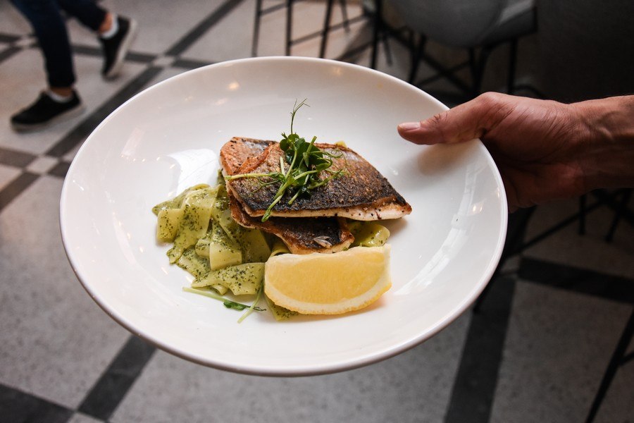 פפרדלה ברוטב שמנת, נתחי סלמון, אפונת גינה, תרד, שעועית ירוקה, יין לבן ושום.