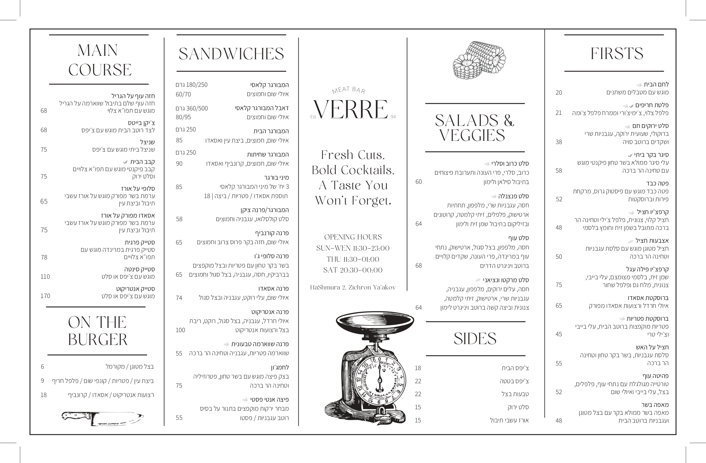 בר מסעדה וקוקטיילים בזכרון יעקב שמציע חוויה קולינרית כיפית ומפנקת. המקום נמצא על כיכר מרכזית ונהנה מאווירה תוססת. במטבח, מבשלים מנות בשריות עשירות העשויות מחומרי גלם טריים ואיכותיים. לצד המנות הטעימות, תוכלו ליהנות ממגוון רחב של קוקטיילים מרעננים... ומקוריים. האווירה הכייפית, האוכל הטרי והקוקטיילים המשובחים יספקו לכם חוויה קולינרית בלתי נשכחת! בואו לבקר אותנו ב- Verre bar! עוד